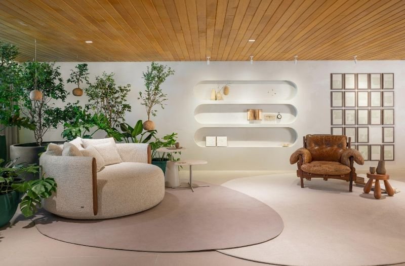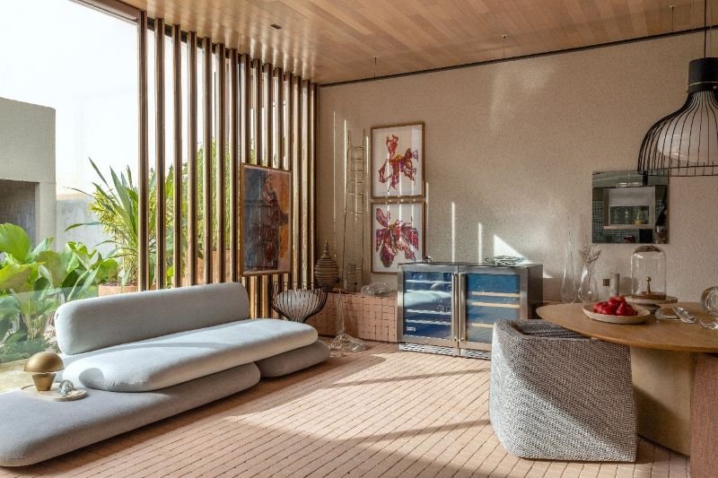 Os forros de madeira maciça criam uma sensação imediata de acolhimento. Os veios orgânicos, as nuances de cor e a textura viva ajudam a equilibrar superfícies frias, ampliam o conforto térmico e acústico e estabelecem uma conexão direta com a natureza — mesmo em apartamentos urbanos. É um recurso que envolve o olhar e convida à permanência.