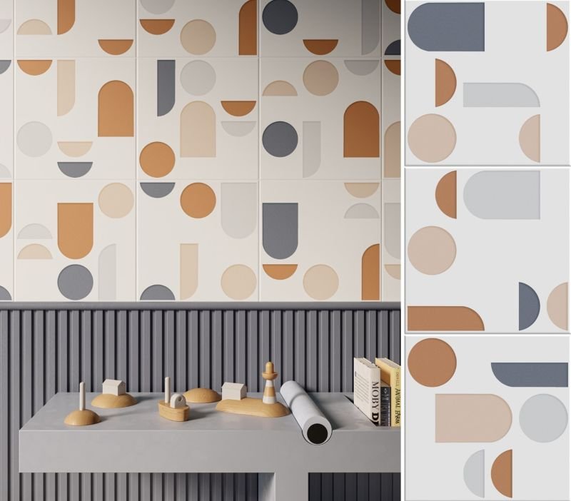 A Série Modern flerta com as formas do Art Déco e com os grandes murais geométricos típicos da azulejaria modernista. A clássica combinação entre terracota e azul aparece em dez estampas distintas, oferecendo uma ampla variedade de composições e possibilidades de paginação.