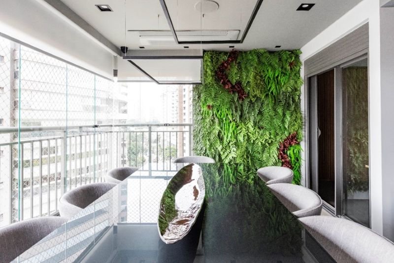 Um dos exemplos mais atemporais da biofilia dentro dos projetos de interiores faz referência à inserção de jardins verticais, que normalmente ocupam um trecho de uma parede e entregam um ponto onde as plantas se tornam protagonistas do ambiente.