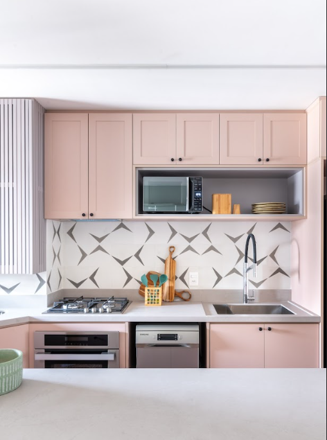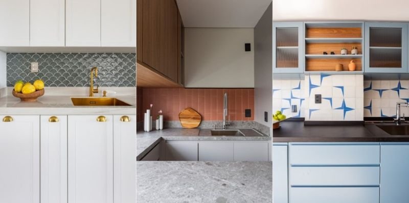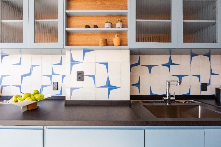 O setor que compreende a parede entre a bancada e os armários, comumente conhecido como backsplash, já é um clássico quando o assunto é um revestimento estilizado. Seja no clássico azulejo, no formato 20 x 20 cm, ou em outras versões, a profissional ressalta o protagonismo de uma cor monocromática ou a associação de tons por meio de desenhos criativos. “É muito interessante elaborar a montagem, que acontece tal qual um quebra-cabeças”, analisa a profissional.