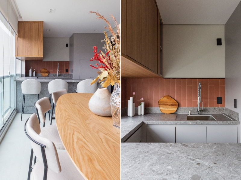 “Gosto de trabalhar os revestimentos, nos seus diversos tamanhos, em backsplashs de cozinhas, áreas gourmet e banheiros”, enumera. “Fica super charmoso e se destacam de uma forma muito interessante”, complementa.