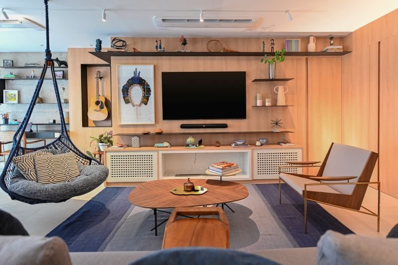 A recomendação é optar pela luz indireta, que proporciona uma atmosfera mais leve e não força tanto a visão. Esse efeito pode ser obtido através de peças como luminárias de mesa, piso ou arandelas com cúpulas; sancas iluminadas e perfis com fitas de led na marcenaria. No geral, o importante é que a luz incida primeiro em uma superfície, ou esteja direcionada para um ponto específico (ex: cantinho da parede), para depois se espalhar pelo ambiente. Outras ideias interessantes para a Sala de TV são pequenos e charmosos pendentes nas laterais dos sofás ou poltronas.