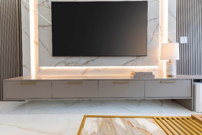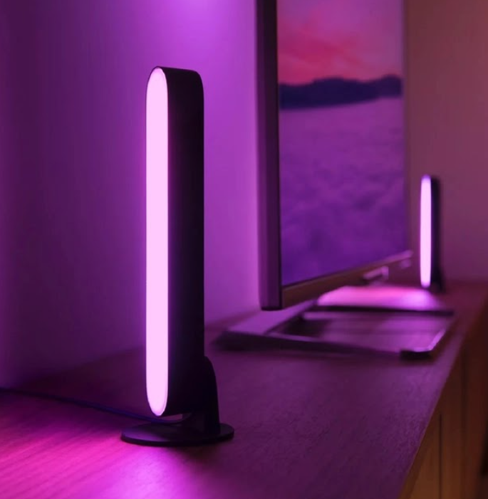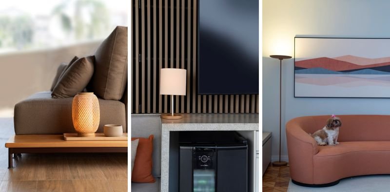 Para quem prefere versatilidade, ou divide a Sala de TV com outros ambientes da casa, a dimerização (regulagem da intensidade da luz) ou a automação podem ser boas opções, por meio de peças específicas com essa função. Entre os exemplos está a Philips Hue – um sistema de iluminação inteligente composto por lâmpadas, fitas e barras de LED, além de luminárias que podem ser acionados por meio de aplicativo, do próprio smartphone (dentro e fora de casa), assim como por comandos de voz com a ajuda de assistentes virtuais como a Alexa e o Google Home.