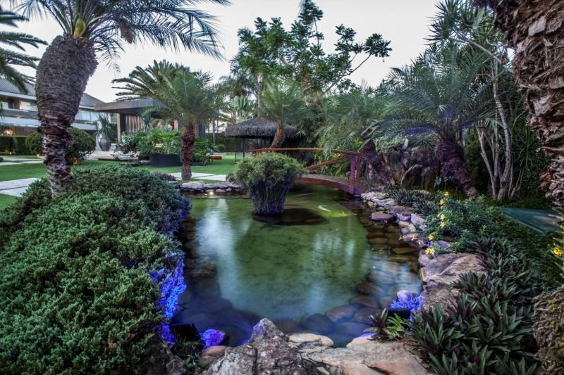 Já para o entorno do lago são bem-vindas espécies tropicais de folhagens e palmeiras, que suavizam as bordas e criam uma transição natural entre o lago e o jardim. Além, é claro, das espécies nativas de cada região, que se adaptam melhor ao clima local, demandam menos manutenção e favorecem a preservação da fauna regional.