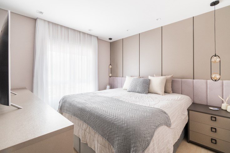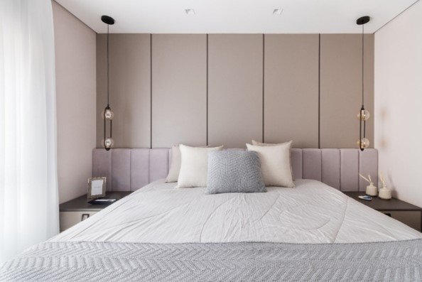 Presente por abajures ou pendentes, a iluminação nas laterais da cama favorece, com propriedade, a percepção de acolhimento – principalmente com o uso de luzes de tons quentes.