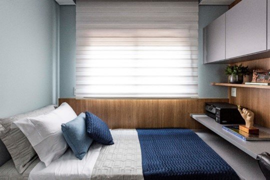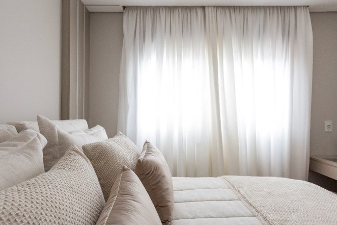 Nessa deliberação, Daniela dá preferência aos materiais sintéticos, pois facilitam a limpeza. Para fortalecer o anseio por um quarto sem nenhuma entrada externa de luz, a tela solar é outro recurso possível e, para tanto, faz-se necessário um espaço no teto para a acomodação da persiana, uma vez que ela enrola para cima quando é aberta. Pensando em um ambiente completamente vedado, ela indica o tecido blackout que pode ser adotado tanto na persiana, como na cortina. “Além da largura da esquadria, um adicional de 20 cm de cada lado auxilia no bloqueio de pequenos vãos de luz nas extremidades”, aconselha a arquiteta.