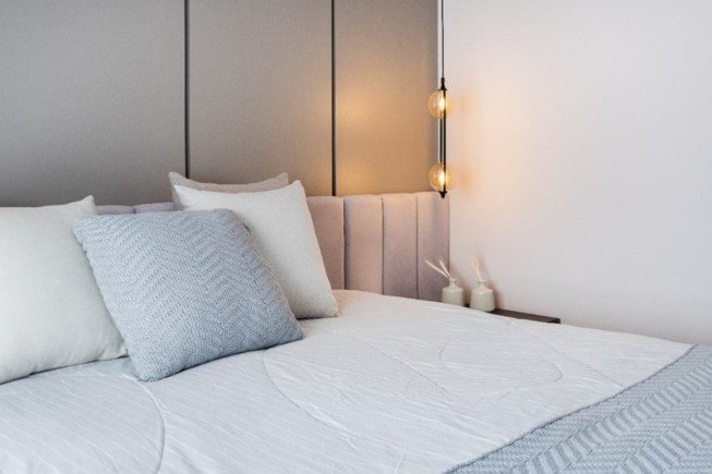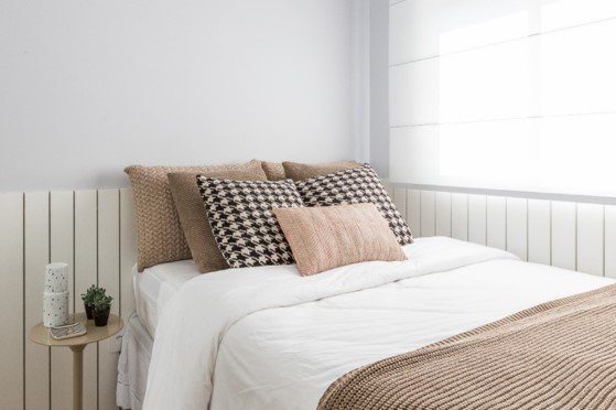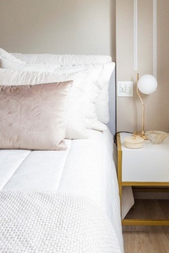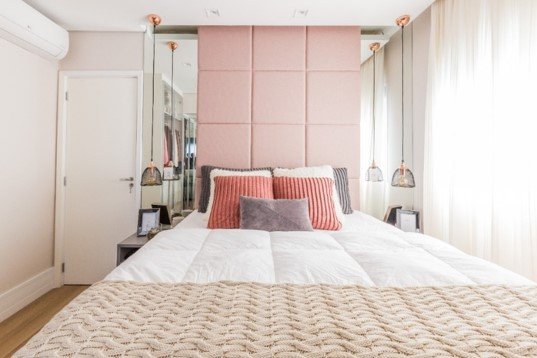 Outra opção é investir em tons claros, mesmo que terrosos ou mais vibrantes, uma vez que as conhecidas candy colors possuem um efeito calmante e acalentador devido à baixa saturação. Assim, as composições cromáticas podem ser harmonizadas na cabeceira, marcenaria, itens de decoração e até acabamentos.