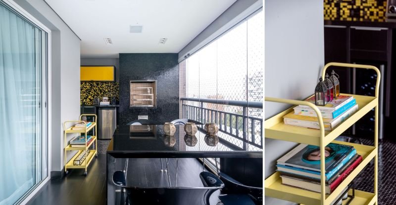 Uma das opções adotadas por Isabella é o uso do carrinho, que podem marcar presença em quaisquer ambientes da casa. Em tubo e chapa de aço carbono com acabamento em pintura epóxi-pó, com criatividade Isabella aproveitou para inserir livros em cada nível. Na área gourmet, eles estão à disposição para o entretenimento de uma leitura não programada.