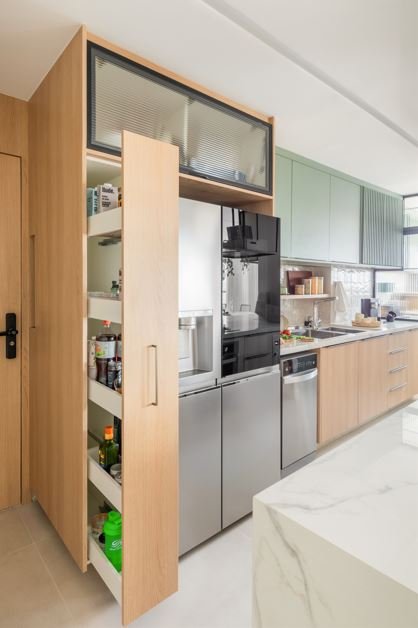 Para Bruno, a personalização faz toda a diferença, pois além das dimensões, a marcenaria é fruto de rotinas individualizadas. Ele exemplifica: “Uma gaveta para especiarias faz todo sentido para quem cozinha bastante, enquanto divisórias para tampas e panelas são perfeitas para ambientes menores. É nesse equilíbrio entre funcionalidade e estética que o projeto ganha vida”, explica.