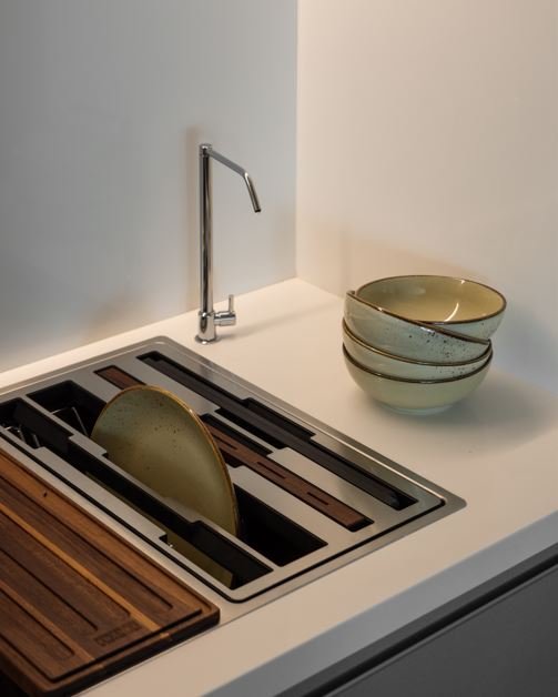 Já as calhas secas funcionam como canaletas multifuncionais para apoiar utensílios e temperos. “A sua durabilidade é extensa, pois são de aço inox, mesmo material das cubas”, assegura o arquiteto. “Sem contar que podemos dispô-las tanto na lateral, como na frente da torneira e em diferentes tamanhos e modelos. Tudo vai depender do espaço disponível”, complementa.