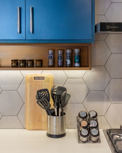 Trilhos metálicos com ganchos, prateleiras abertas e nichos expostos são recursos interessantes para compor o visual da cozinha. “São esses pequenos detalhes que mostram a força do projeto. Eles não aparecem tanto na primeira impressão, mas no dia a dia ressignificam a vida na cozinha”, finaliza o arquiteto Bruno Moraes.