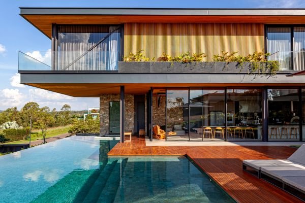 Se na arquitetura de interiores vivemos um desejo tão proeminente de conexão com o natural, na parte externa das residências ou condomínios esse anseio fica muito mais evidente dentro de uma abordagem biofílica dos projetos. Esteticamente, a madeira inspira harmoniza, acolhimento e permanência, considerando que essas áreas precisam, de fato, entregar essas sensações durante os momentos de lazer.