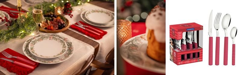 A Tramontina traz vários produtos da coleção Noite Feliz, como pratos rasos, de sobremesa ou para colocar o panetone, além de bowls, xícaras e pires decorados com motivos natalinos. As peças são produzidas com porcelana de alta qualidade e podem ser colocadas no micro-ondas e na lava-louças. Sua praticidade é aliada à beleza, tornando o dia a dia mais fácil. Além disso, a empresa também indica o Faqueiro Casa Natal, de 16 peças (garfos, facas e colheres com lâminas em aço inox e cabos de polipropileno) na cor viva magenta e detalhes listrados para dar um toque especial à mesa de Natal. Mais informações: www.tramontina.com.br