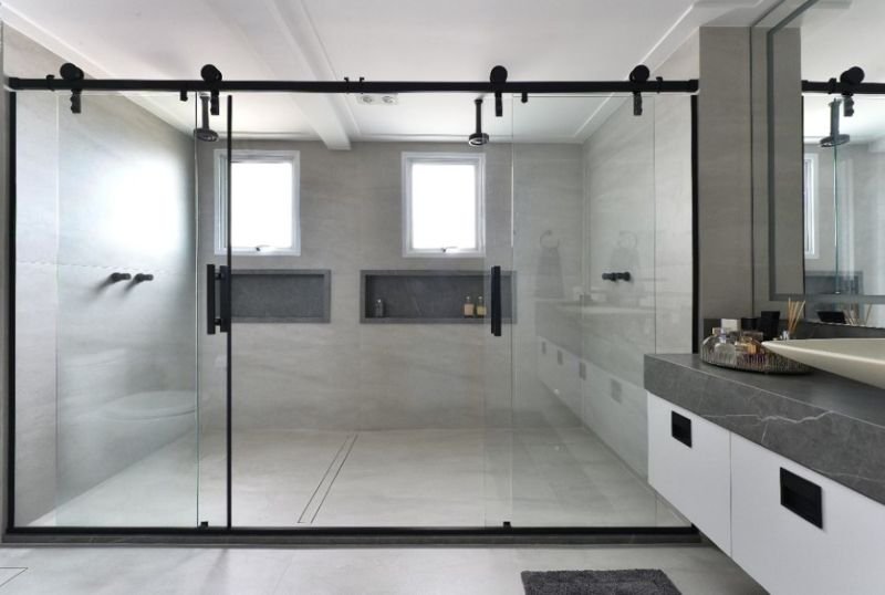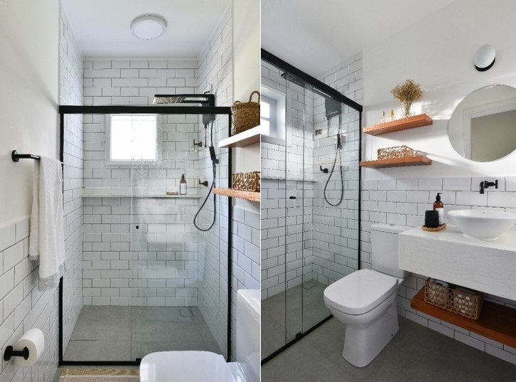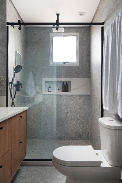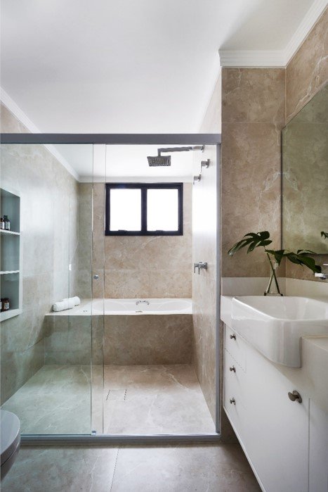 Os nichos embutidos conquistaram a arquitetura de interiores: com a abertura de um vão na parede com, pelo menos, 10 cm de profundidade, na experiência de Rosangela eles entregam eficiência e um visual minimalista. “Guardar o shampoo e o condicionador no nicho é tão intuitivo que fica muito difícil deixar o box desorganizado”, comenta.