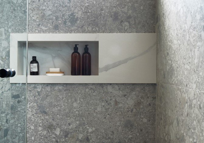 E ao invés de suportes que ocupam espaço e se deterioram com o peso dos produtos e o tempo de uso, a profissional aponta o nicho embutido como o recurso ideal para acomodar os itens de higiene.