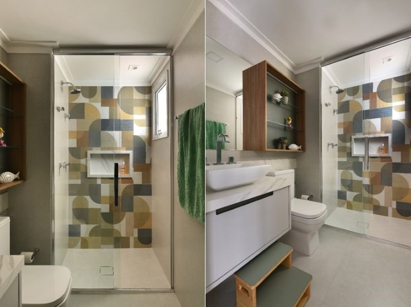 “Esse recurso fica ótimo com uma base neutra nos demais revestimentos e elementos do banheiro, pois dessa forma a parede do box se torna uma verdadeira protagonista do cômodo”, orienta a profissional.