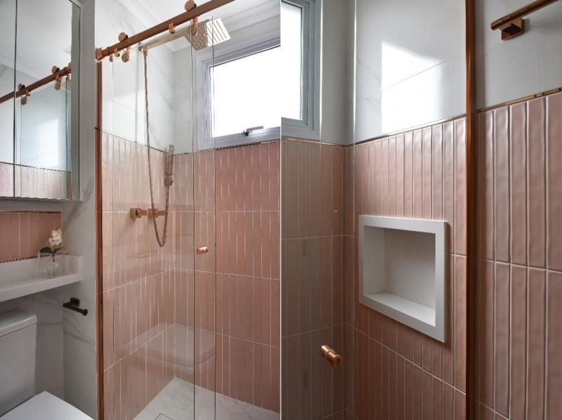 Com uma aura romântica, que inclui a combinação do revestimento rosa e branco, que completa o pé-direito, a cor se completa com o chuveiro e os demais metais presentes no projeto.