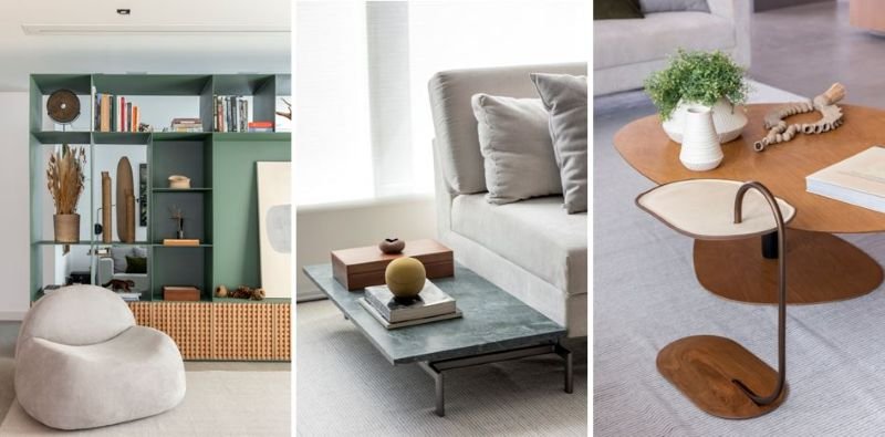 ● Mesas de apoio e laterais: úteis para apoiar luminárias, livros ou uma bebida, como uma xícara de café ao lado do sofá.