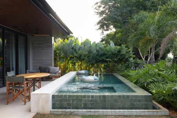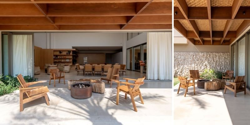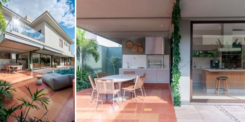 Ao ar livre, a piscina com spa de hidromassagem recebe o Sol em várias horas do dia, enquanto no espaço ao fundo, ao lado da churrasqueira, as arquitetas Vanessa Paiva e Claudia Passarini criaram um fogo de chão, rodeado de poltronas e perfeito para as noites com vinho.