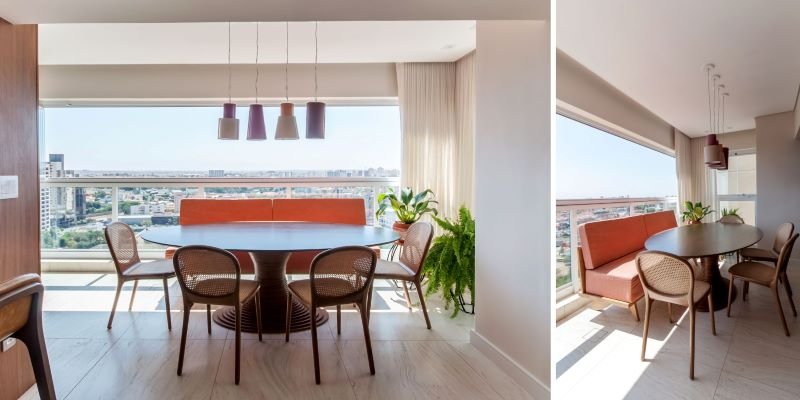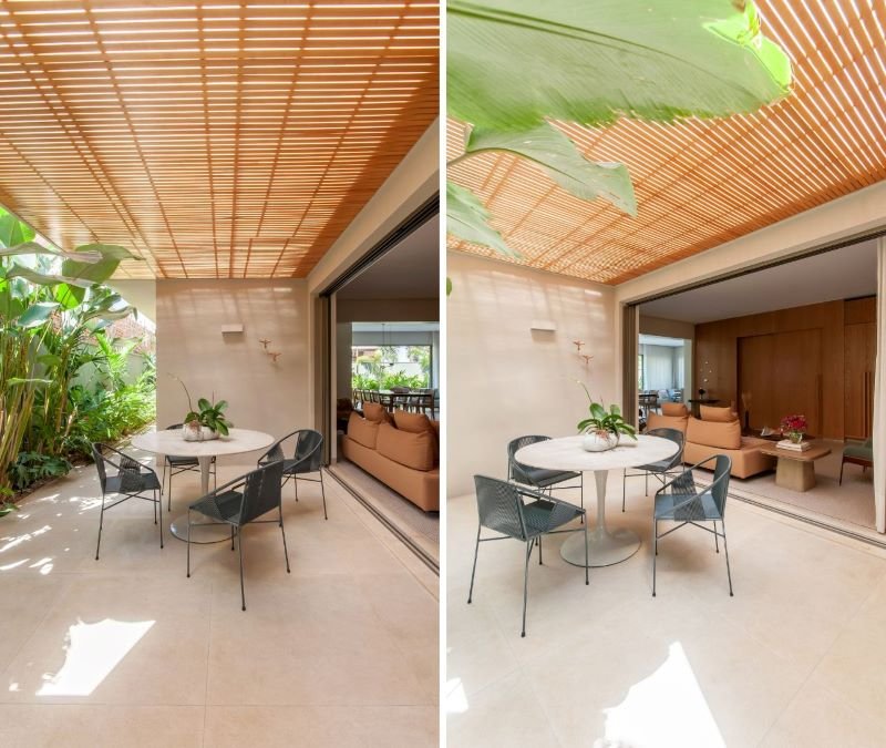 Com o aspecto de uma marquise, o ripado que acoberta a varanda permite que os moradores possam desfrutar o espaço com conforto e a presença da iluminação natural. “Investimos em um décor minimalista ao eleger apenas a mesa com as quatro cadeiras”, dizem as arquitetas. Uma vez que o living está muito próximo e separado apenas pelas esquadrias de vidro, a mesa redonda é uma extensão para um chá da tarde e ocasiões mais intimistas.