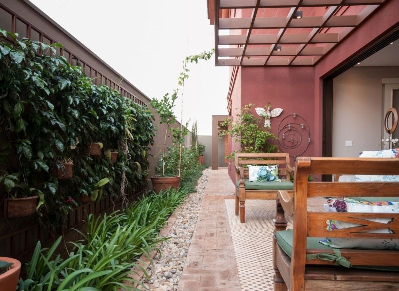 “Muitos clientes nos pedem varandas que funcionem como uma segunda sala, agregando a leveza do lado externo da residência”, relata Claudia Passarini. Nesta casa, elas delinearam o projeto com ares de um antigo casarão. Os móveis talhados em madeira se completam com o piso rústico e o painel que sustenta as plantas em vasos.