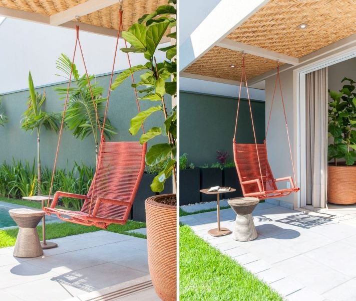 Embora as varandas estimulem o convívio, o local também tem a força de evocar a paz interior. Na marquise formada nos fundos desta residência, a cobertura inspira o estar consigo e tem o balanço como item fundamental para os momentos de relaxamento.