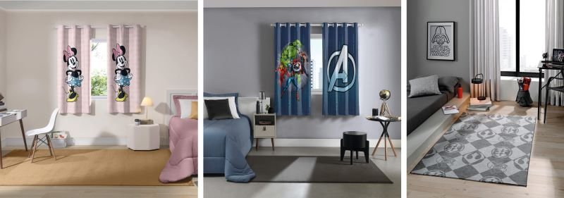 O mundo mágico da Disney está presente na Bella&Co! A empresa traz as cortinas Blackout Poliéster (2,40m x 1,70m) da Minnie e Corta Luz de tecido (2,60m x 1,70m) Avengers, além do tapete Jacquard Decor StarWars 1,40m x 2,00m – Darth Symbols, ou seja, são produtos para todos os gostos! Mais informações: www.bellaeco.com.br