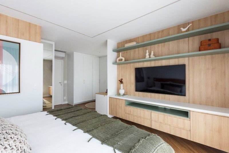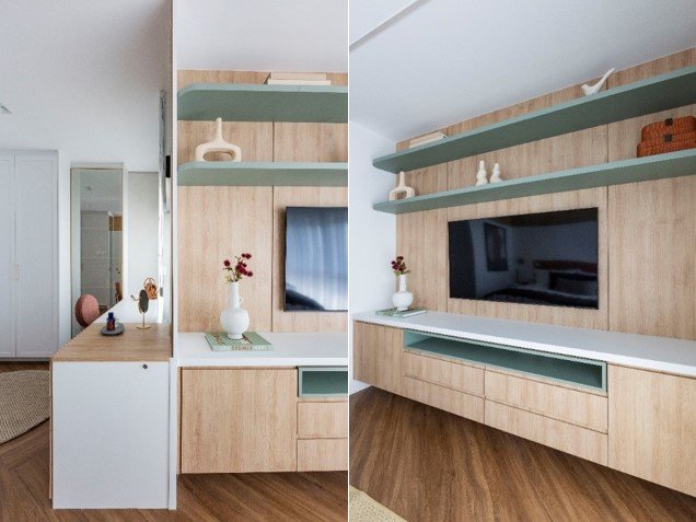 Com uma marcenaria bem planejada é possível desenvolver o painel de sustentação da TV, além de rack, nichos e prateleiras. Tudo isso somado com possíveis divisórias para outros ambientes. “Em um dos nossos trabalhos, onde a parede em frente a cama virou a protagonista, conseguimos uma conexão com o closet, desenvolvendo um rack que segue até a penteadeira”, diz Mari Milani. O resultado não poderia ter ficado mais estilizado, com prateleiras, gavetas e nichos num tom mentolado de verde e ripas de madeira que delimitam os dois cantinhos.
