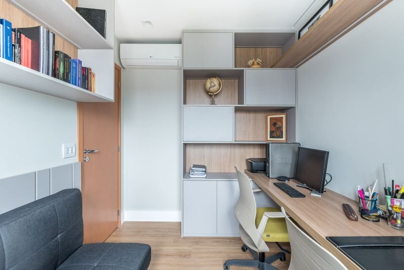 • Escritórios: é possível preencher toda a parede com uma estante do piso ao teto, ou então instalar de uma a duas prateleiras a 1,40 m acima da mesa.