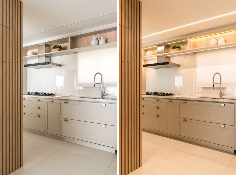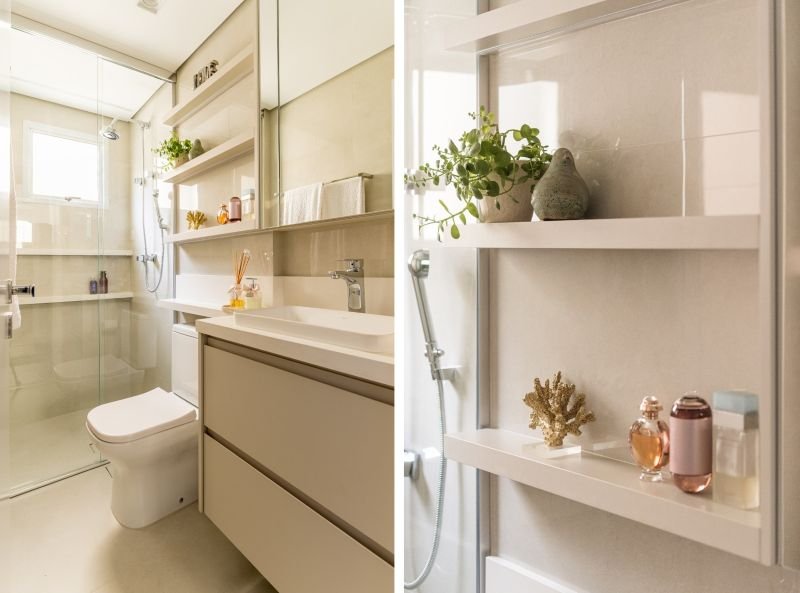 De acordo com o ambiente, recomenda-se o uso de materiais resistentes à umidade e gordura. Em cozinhas e banheiros, Cinthia indica prateleiras de pedra como granito, quartzo ou lâmina.