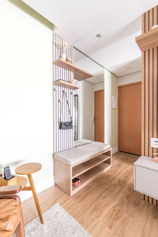 Uma solução adotada com frequência em alguns ambientes são as prateleiras embutidas. “Geralmente, a colocação é considerada quando há um comprometimento da circulação ou quando a proposta se torna mais interessante”, diz a arquiteta.