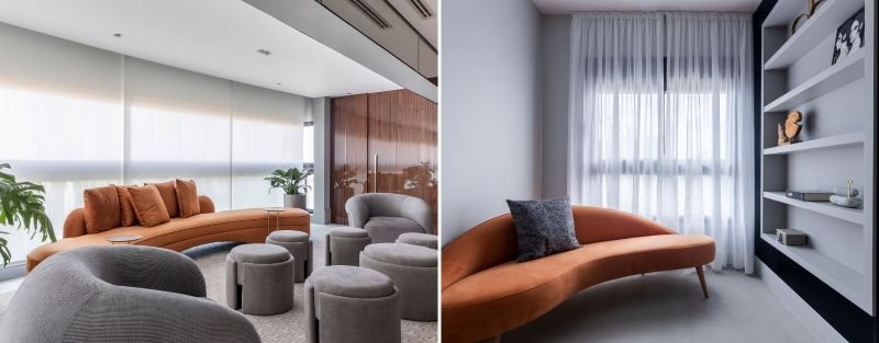 ‘Parente’ do terracota, só de bater o olho o sofá laranja entrega seu vigor. E não é para menos: a cor traz jovialidade e o entusiasmo que estimula as pessoas – principalmente quando está presente na decoração de interiores. Para usá-la com êxito, a profissional indica a combinação com bases neutras que propiciem harmonia visual.