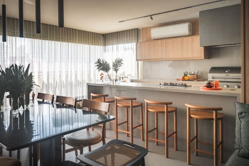 Para garantir mais comodidade e praticidade como todos desejam, as profissionais avaliam que a estrutura deve ser pensada de acordo com o tamanho do ambiente e com as atividades que serão realizadas. “Bancadas generosas ajudam no preparo dos alimentos, mas também funcionam como ponto de encontro para conversas e pequenas refeições”, exemplificam, indicando uma outra solução: “inserir banquetas ou uma pequena mesa junto à bancada elimina a solidão de quem está cozinhando. A presença próxima permite que todos possam interagir”.