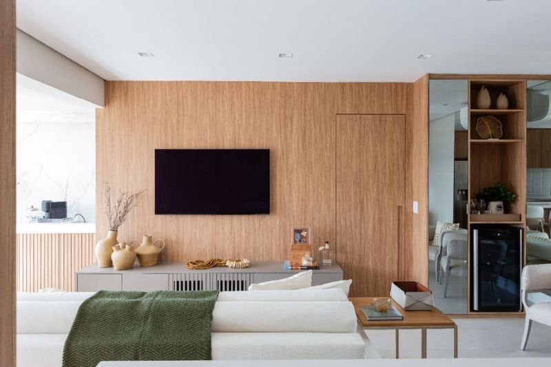 Segundo Daniela, para o caso de livings e áreas de convivência, vale contar com folhas de madeiras em cortes mais amplos para conceber a composição, uma vez que elas podem abranger toda a área em painéis de maior escala.