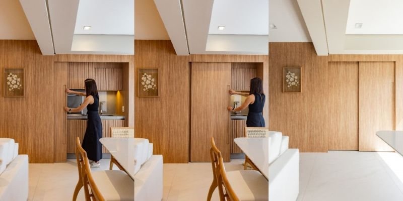 Com o advento da integração entre os ambientes da área social, a marcenaria contínua se encaixa perfeitamente no layout e na metragem disponível. Com essa flexibilidade, a madeira pode se estender e mesclar painéis, portas, aparadores, cristaleiras, buffets, pilares, vigas, racks e muito mais, criando inúmeras possibilidades conforme as necessidades e características do projeto.